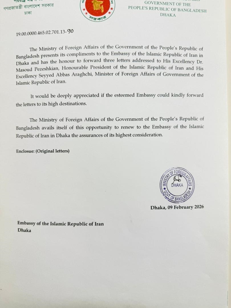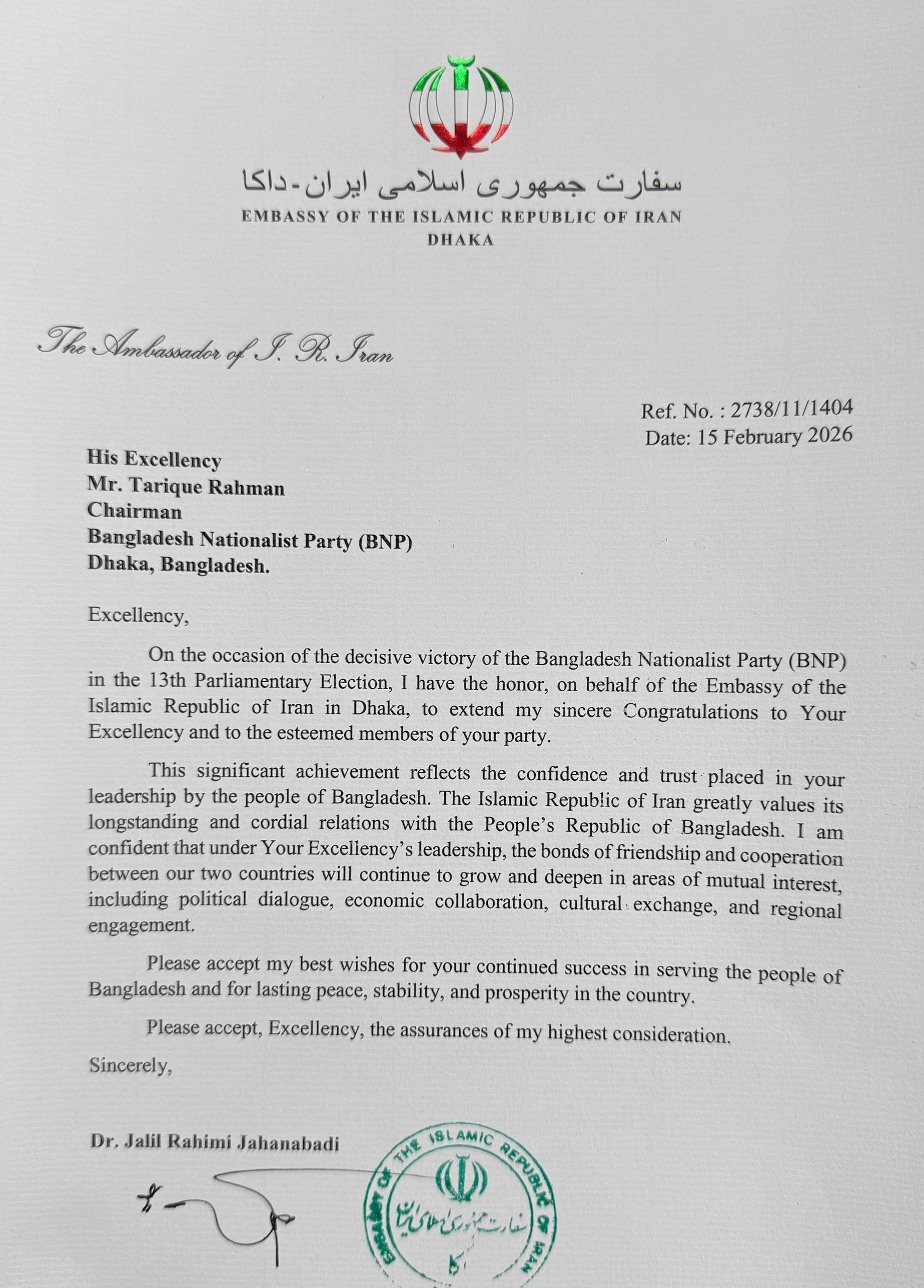 پیام تبریک سفیر جمهوری اسلامی ایران به رهبر حزب ملی گرای بنگلادش